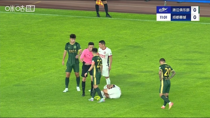 09月26日讯 中超第26轮,浙江vs蓉城,第12分钟,苏超直播在线观看蓉城球员莱切特疑似肌肉拉伤 痛苦倒地,队医进场治疗。