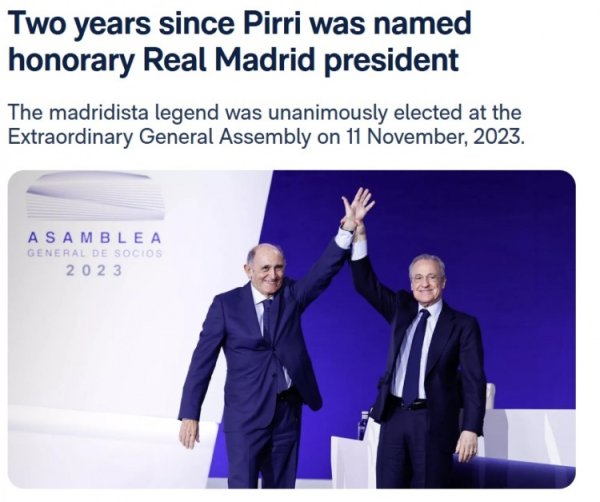 皮里担任皇马荣誉主席已满两周年,皇马官方发文纪念
