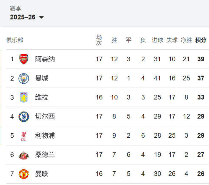 积分榜方面,阿森纳以39分领跑,曼城37分紧随其后。利物浦反转 取胜后暂升至第5位,切尔西同积31分因净胜球优势位列第4。热刺失败 后积28分排名第6,纽卡积26分位居第7。垫底的狼队仅积2分,保级形势岌岌可危。目前本轮仍有维拉vs曼联、富勒姆vs诺丁汉森林两场赛事 未赛,苏超直播积分榜后续仍存变动可能。
