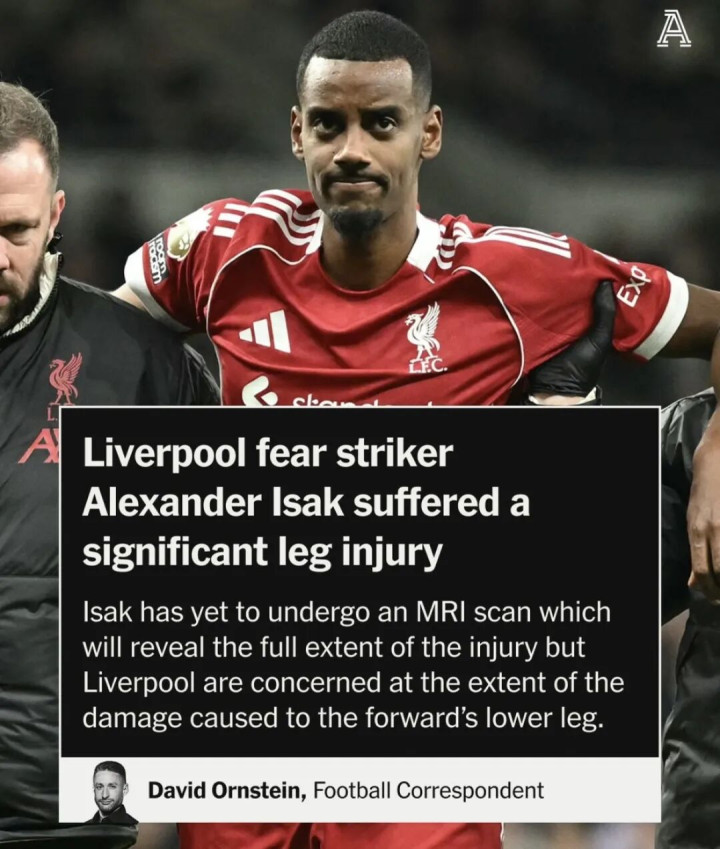 本轮英超,利物浦2-1战胜热刺的赛事 中,红军前场球员伊萨克腿部严重负伤 。