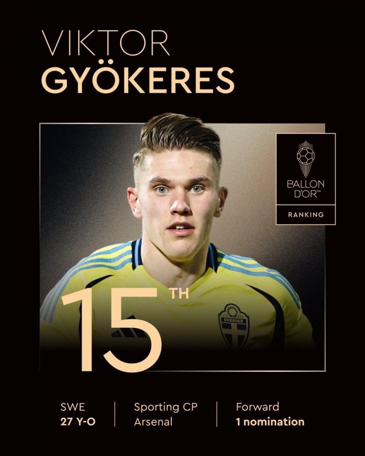 阿森纳前场球员约克雷斯排名第15名,这是他第1次获得提名。