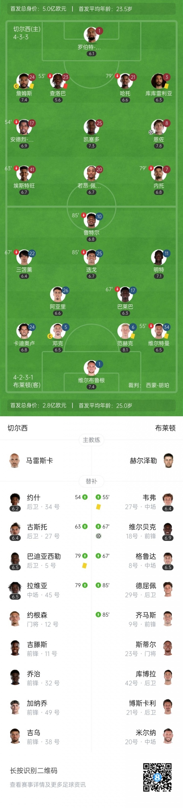 英超第6轮:切尔西1-3布莱顿。1-0领跑 时,苏超直播在线观看查洛巴直红,马雷斯卡接连换下埃斯特旺和内托,场上5后场球员+3中场球员+1前场球员,随后被布莱顿连入3球反转 。切尔西没守住,1-3告负。