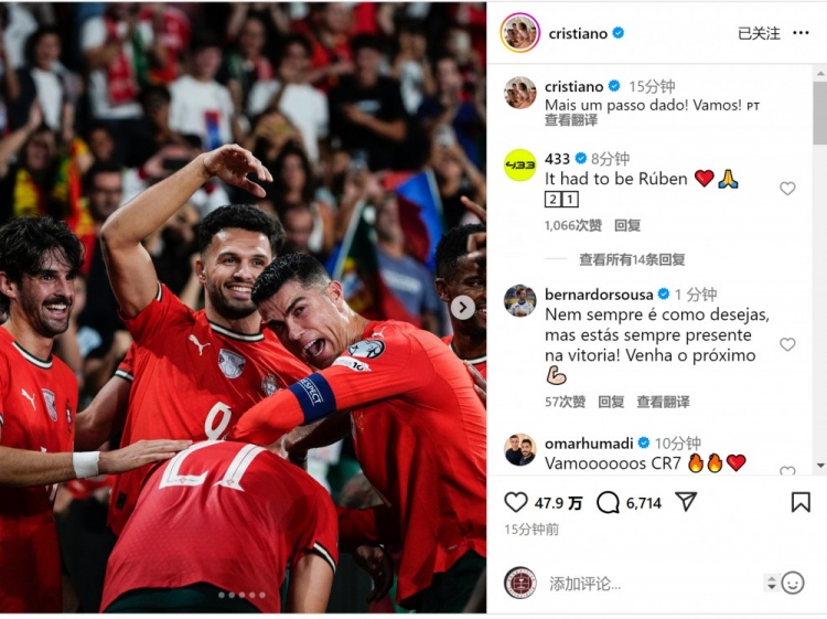 击败爱尔兰!C罗社媒晒照庆祝获胜 :又迈出一步,助威 !