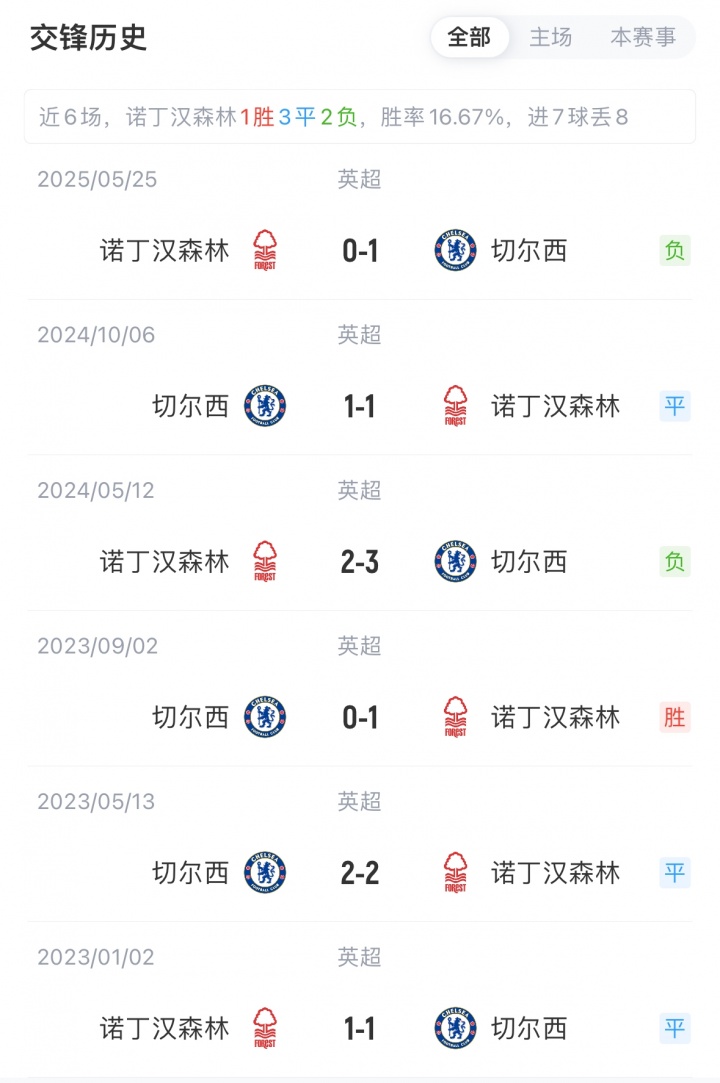 切尔西3胜2平2负积11分暂列英超第7,近4轮仅1胜;诺丁汉森林1胜2平4负积5分暂列第17,近期遭遇六轮不胜。