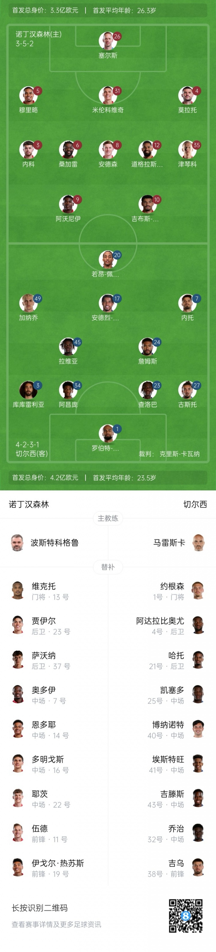 诺丁汉森林杆位:26-塞尔斯、4-莫拉托、5-穆里略、35-津琴科、31-米伦科维奇、6-桑加雷、12-道格拉斯-路易斯、8-E-安德森、10-吉布斯-怀特、9-阿沃尼伊、3-内科-威廉姆斯