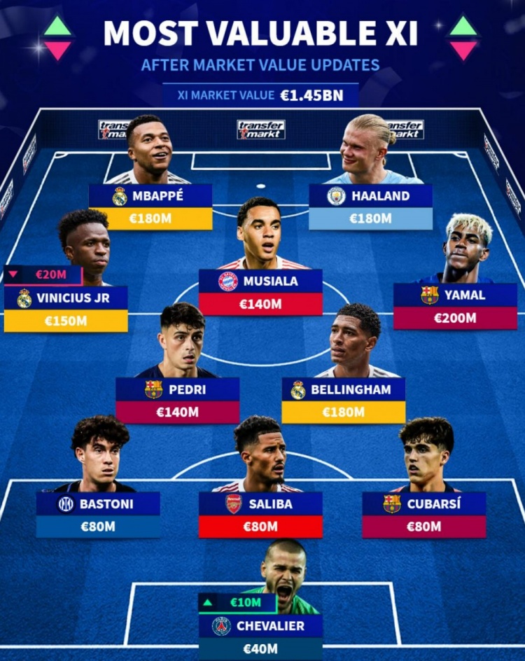 10月19日讯 德转此前更新了足坛球员身价,并盘点了目前身价最高的11人阵形 ,总身价14.5亿欧,其中亚马尔2亿欧最高,具体阵形 如下: