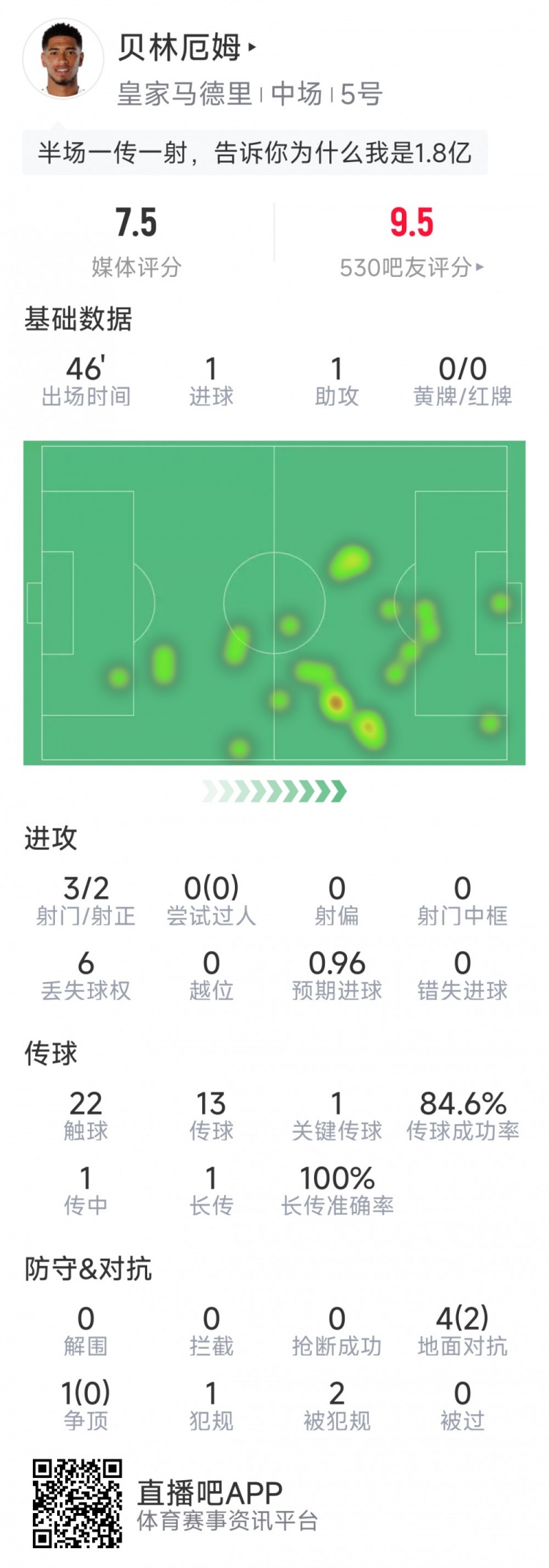 贝林厄姆半场数据:1得分 1助功 ,3射2正,1次关键传送球 ,评分7.5分