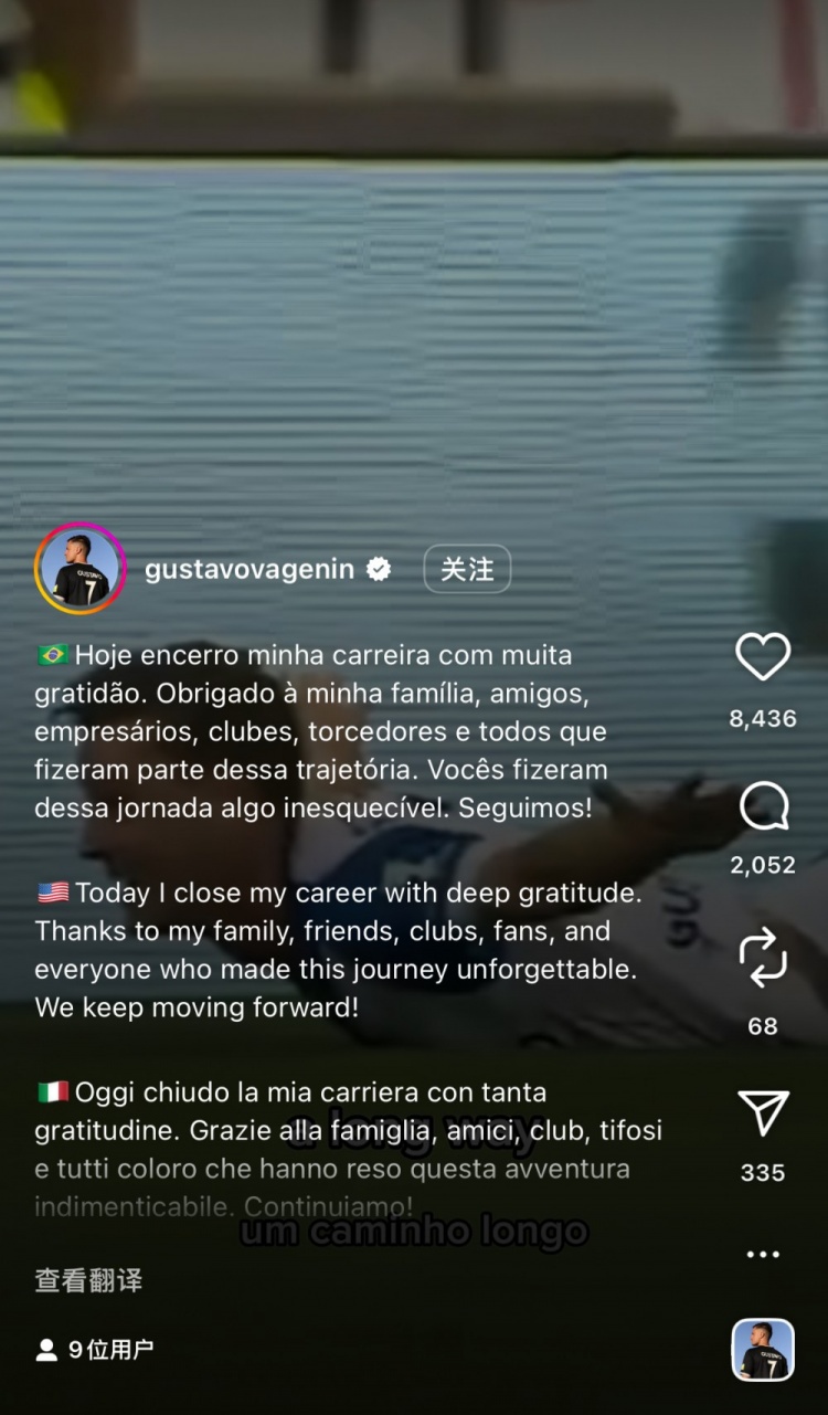 古斯塔沃写道:“今天,我满怀感恩结束自己的职业生涯。感谢我的家人、朋友、俱乐部以及所有支持我的人们。继续前行!”