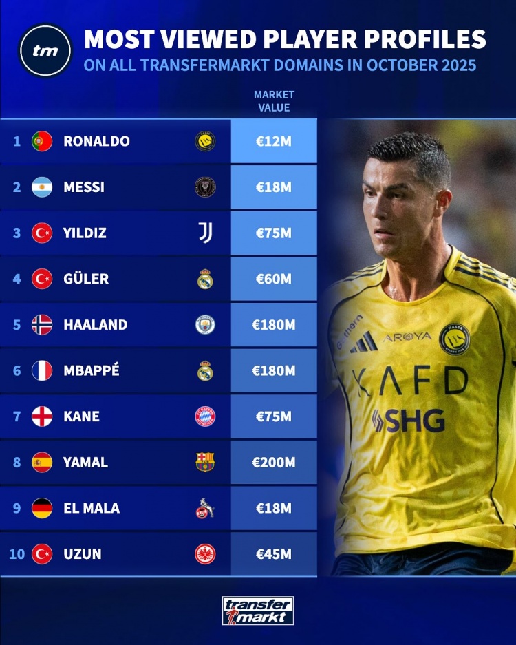 10月德转球员页面浏览量排名:C罗居首,梅西、伊尔迪兹二三位