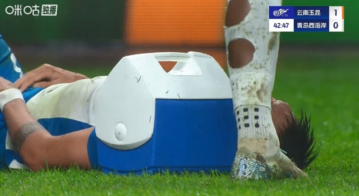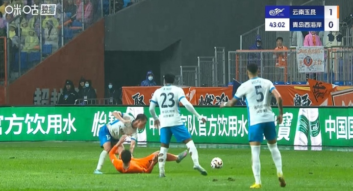 这下太痛了!第43分钟,宋浩宇防卫 时被倒地的罗竞踢到裆部