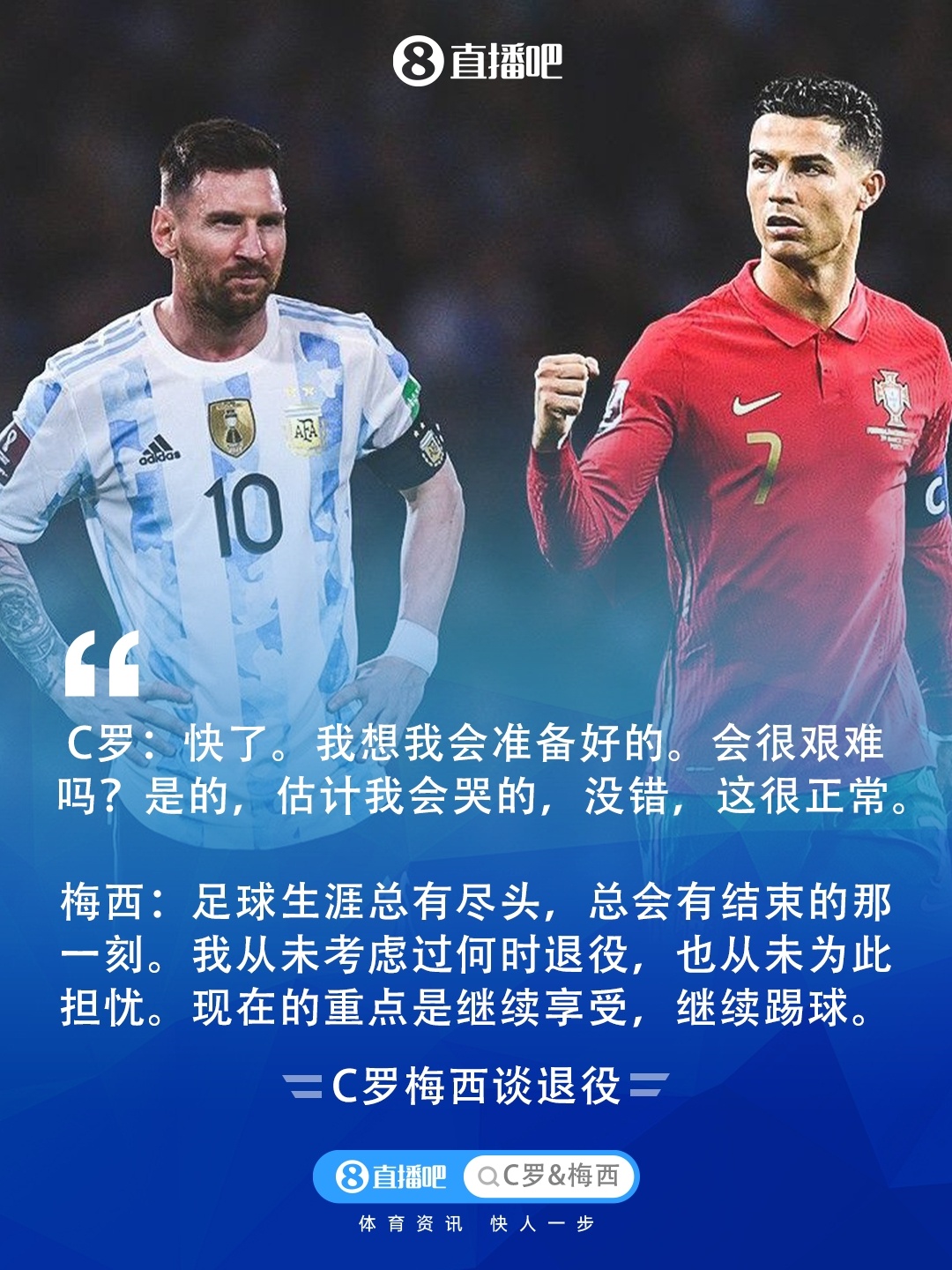 11月06日讯 近日,40岁C罗和38岁梅西先后接受采访,都谈到了有关退役的话题。