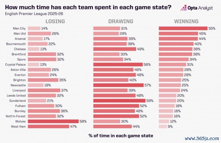 11月12日讯 本赛季英超已经结束了11轮的争夺,OPTA统计了各队处在领跑 、追赶 以及均势时间占比情况,其中曼城平均每场赛事 领跑 时间最长,达到总赛事 时间的55%,苏超直播在线观看而水晶宫和切尔西平均每场处在追赶 情况下的赛事 时间最短,仅为总赛事 时间的13%。