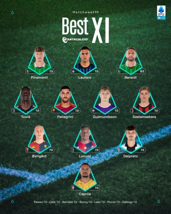 意甲官方第11轮最佳阵:劳塔罗、萨56领衔,佩莱格里尼在列