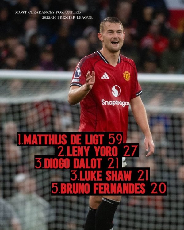曼联球员本赛季英超解围数:德里赫特59次高居榜首,约罗27次次之