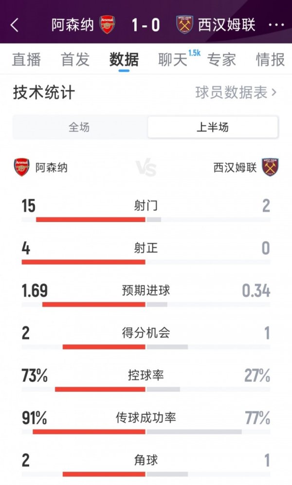 全面占优,阿森纳1-0西汉姆半场数据:射球 15-2,射正4-0