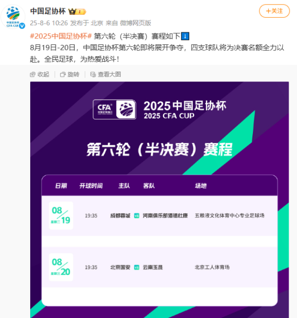 足协杯两场准总决赛 时间敲定 将于8月19日和20日进行